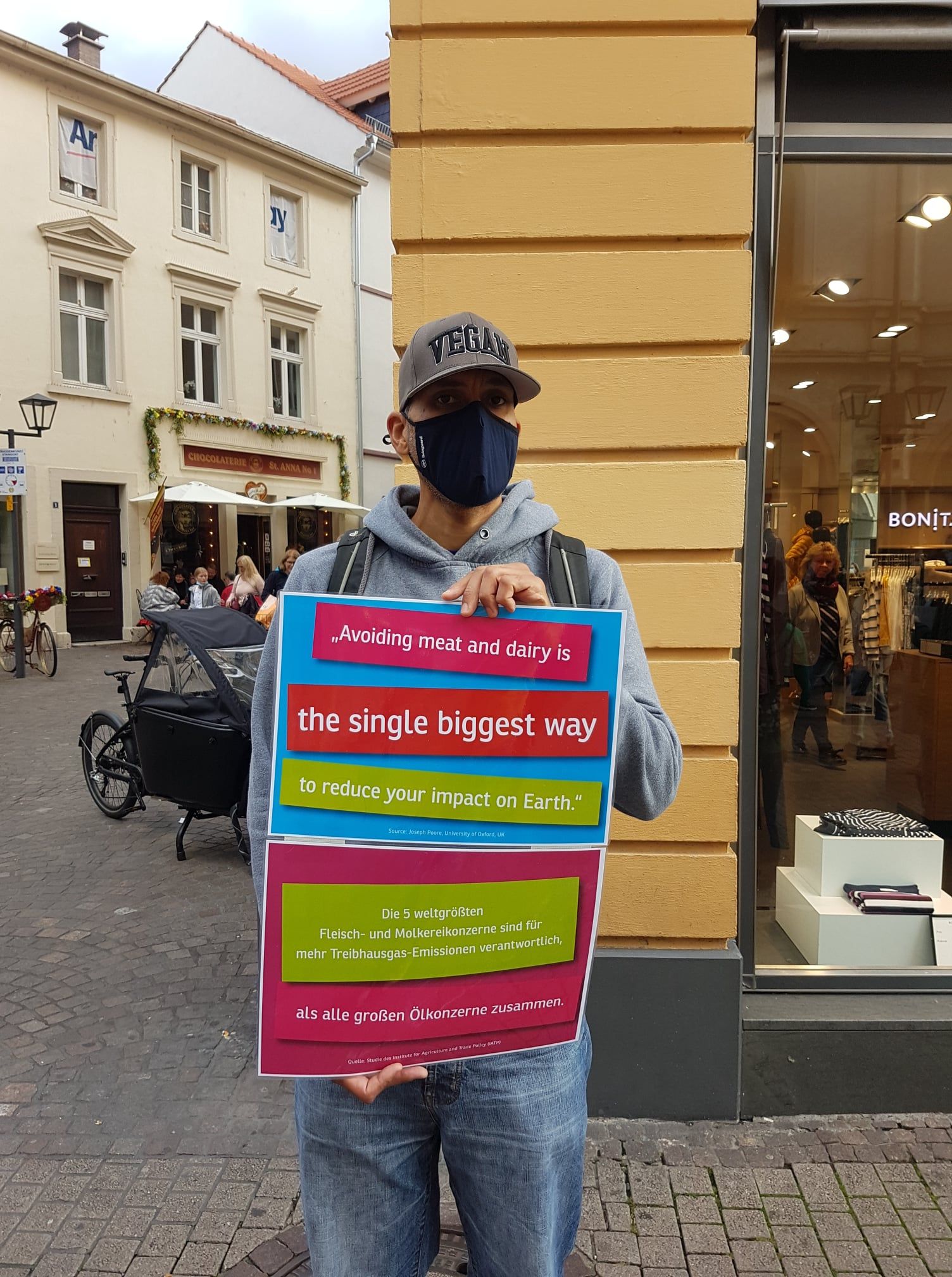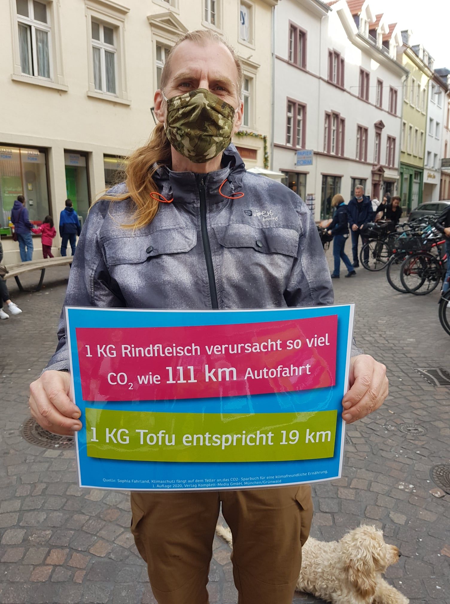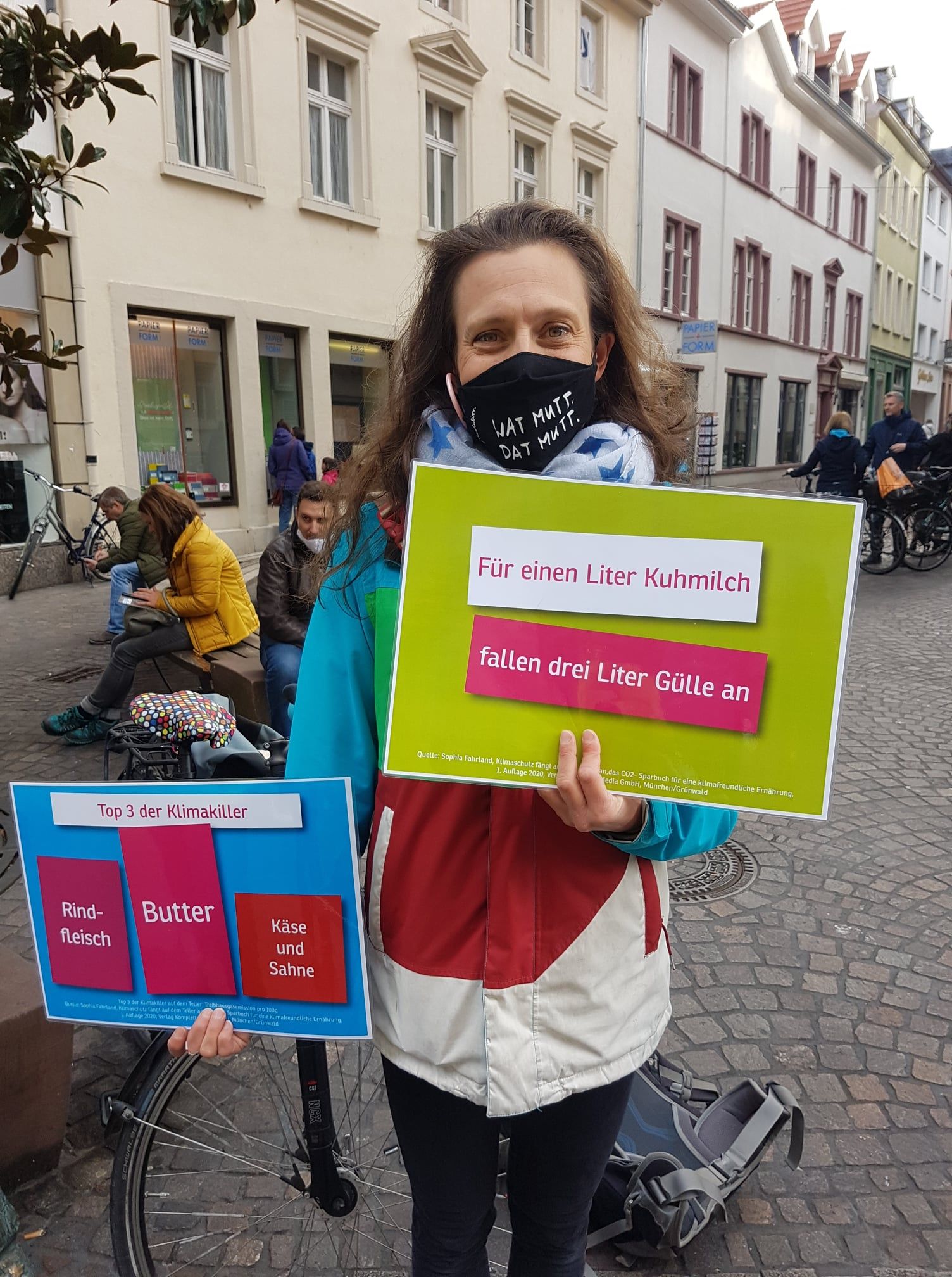 Wir machen mit Plakaten darauf aufmerksam, dass die Produktion und der Verzehr tierischer Produkte einen wesentlichen Anteil am Klimawandel haben.