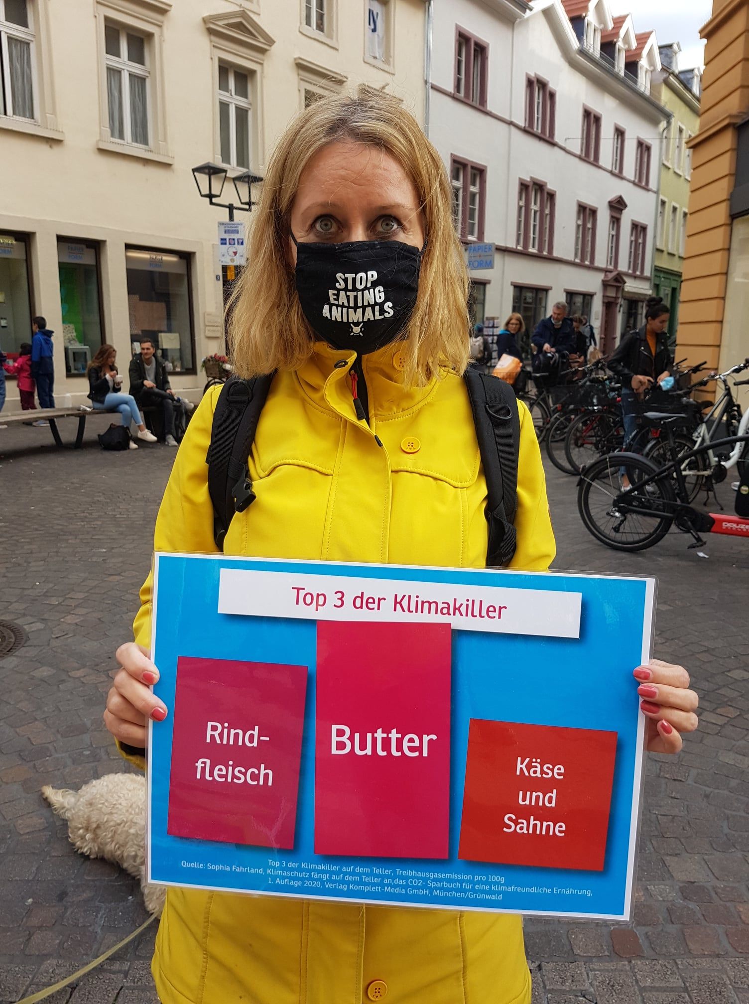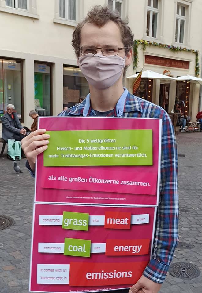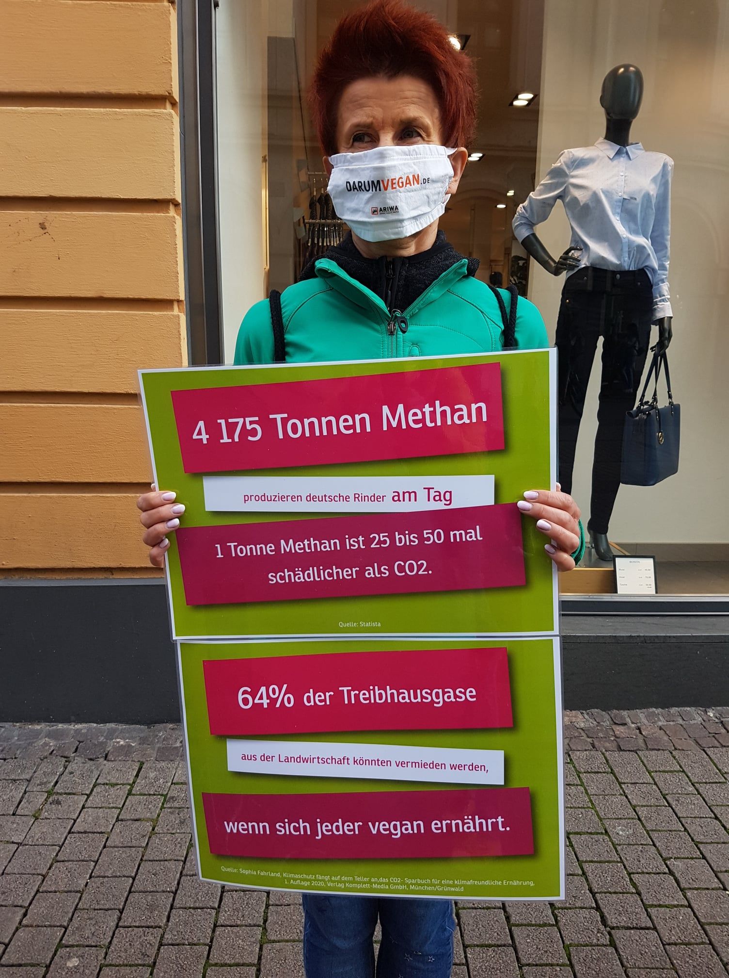 Wir machen mit Plakaten darauf aufmerksam, dass die Produktion und der Verzehr tierischer Produkte einen wesentlichen Anteil am Klimawandel haben.